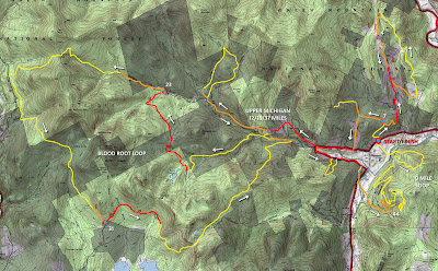 We returned to the Upper Michigan Road aid station where I had planned to take a slightly longer break in preparation for the Blood Root Loop, 19 miles (or 22 depending who you ask) of the toughest terrain on the course with only two aid stations. I changed my wet and muddy socks here, picked up my hydration pack and had a few sips of Coke before heading back out. The Blood Root Loop started with a short descent almost too steep to run and then made a gradual climb over the next few miles through wet and sloppy snowmobile trails. It was still well before noon but the temperature had been quickly rising and we were starting to feel it. There was another runner with Zak and I but none of us were feeling like talking much. The fun was over and it was time to get down to business.